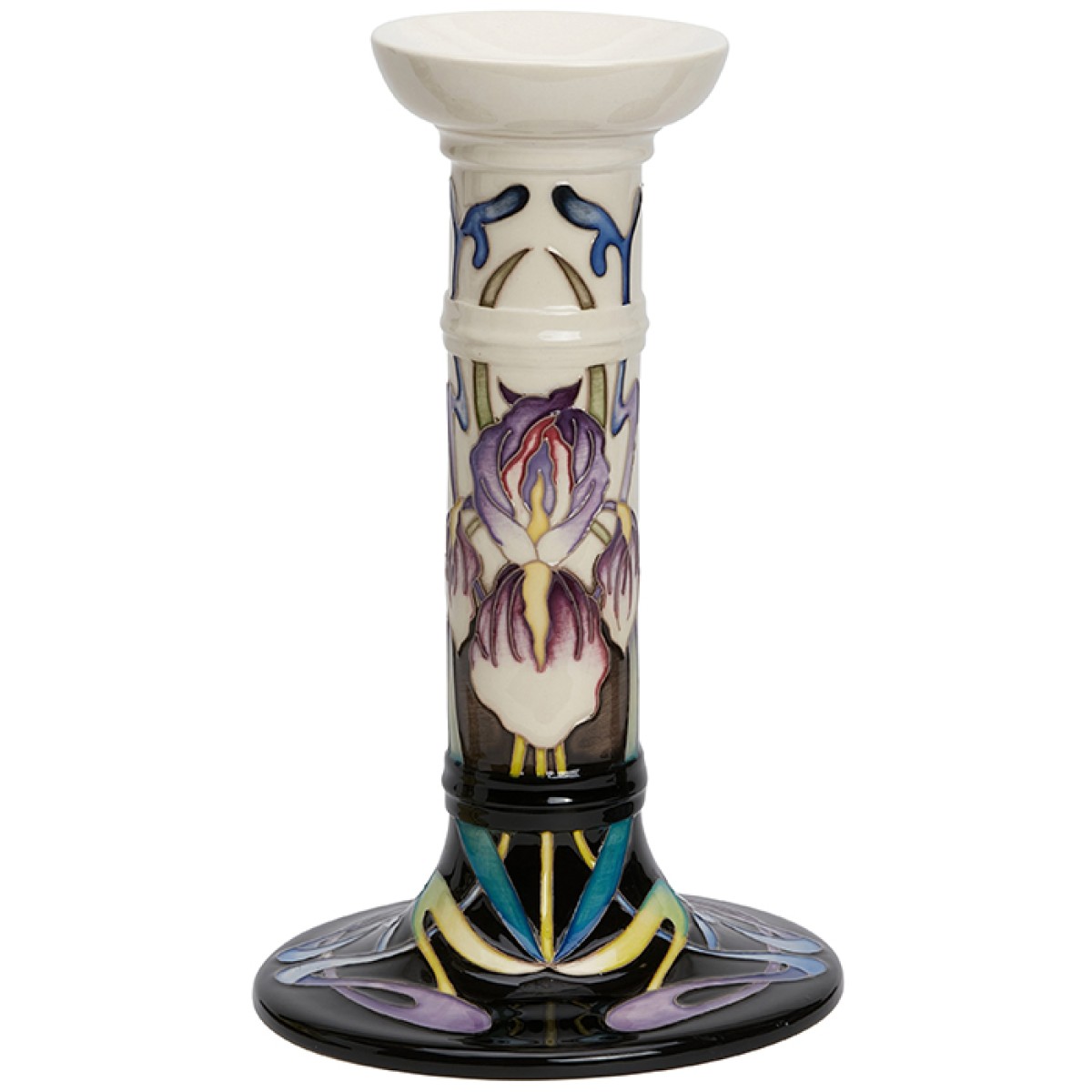 A lone iris, a popular Art Nouveau flower, is held between a soft white band and a black base band, as it bursts centre stage. In exquisite synchronicity, spear-like blooms and riotous hues of violet, mauve and blushes of pink excite. The iris has a rare quality in its ability to inspire Nicola, not only as she strives to capture its elegant form, but in many cases to cultivate the design with exceptional line work. Nicola has surpassed expectations with her remarkable line work at the foot of this candlestick, allowing the design to hold a Foundation of Beauty.