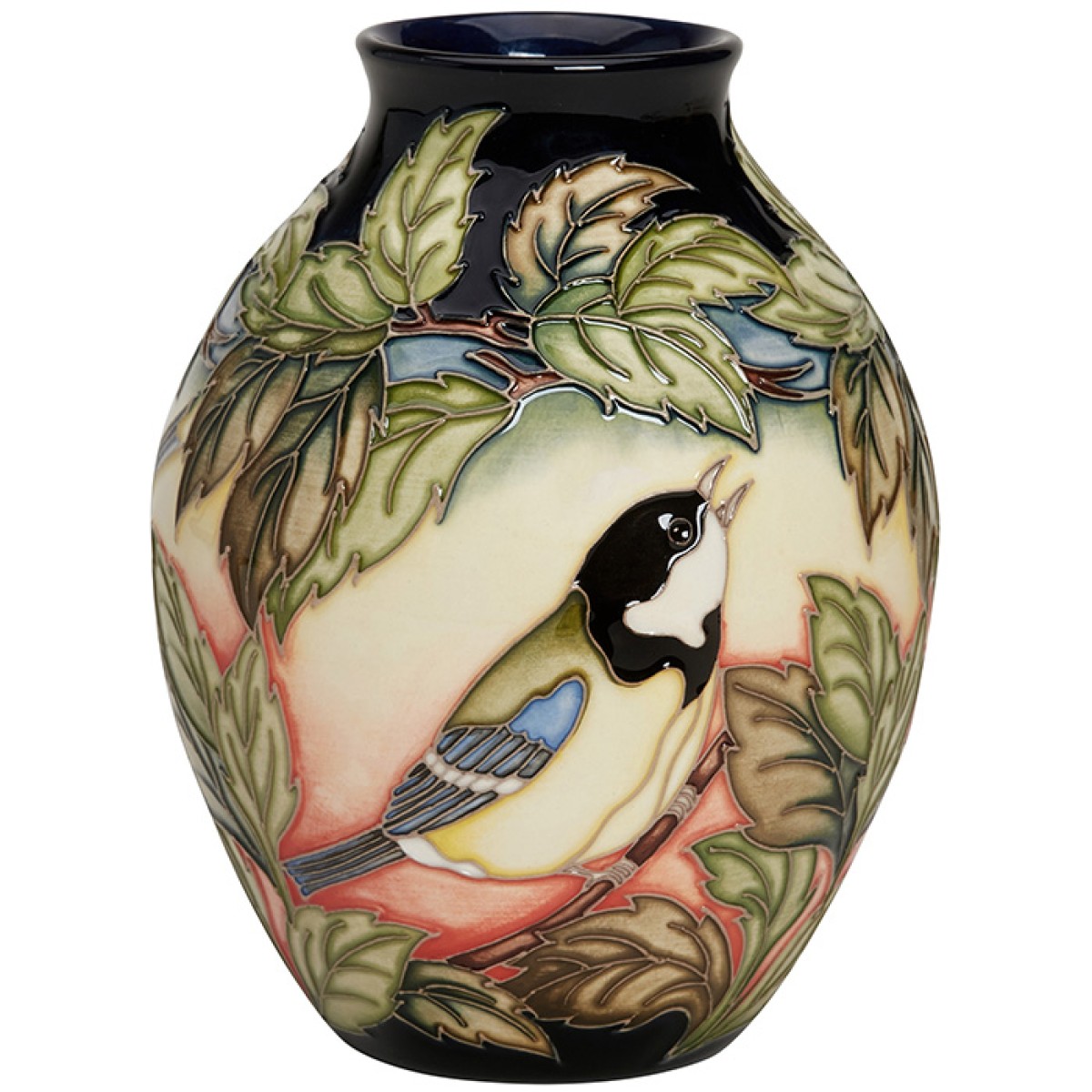 One of the first birds to start singing in Spring, Great Tits offer a memorable Dawn Chorus. The Moorcroft designer infused her setting with a glorious reddish-haze, where a striking little Great Tit, with a bluish-green back and a canary-yellow breast divided by a central sheer-black stripe, balances on a branch calling, no doubt, with its huge range of songs and calls across the lush Spring canopy. Turn the vase around, and our gentle Star of Spring charms with its inquisitive inspection of the woodland floor below for any peeping worms.