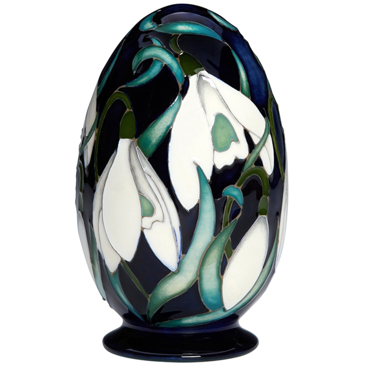 As winter begins to release its icy grip, many of us can be found tiptoeing through country estates admiring the erumpent shoots of snowdrops up close. Enjoying winter walks and gaining great pleasure on discovering snowdrop is something many of us do to blow the cobwebs away after long days indoors. Rachel Bishop’s design captures a cluster of snowdrops nestled amongst turquoise leaves upon a bramble blue-based egg shape.