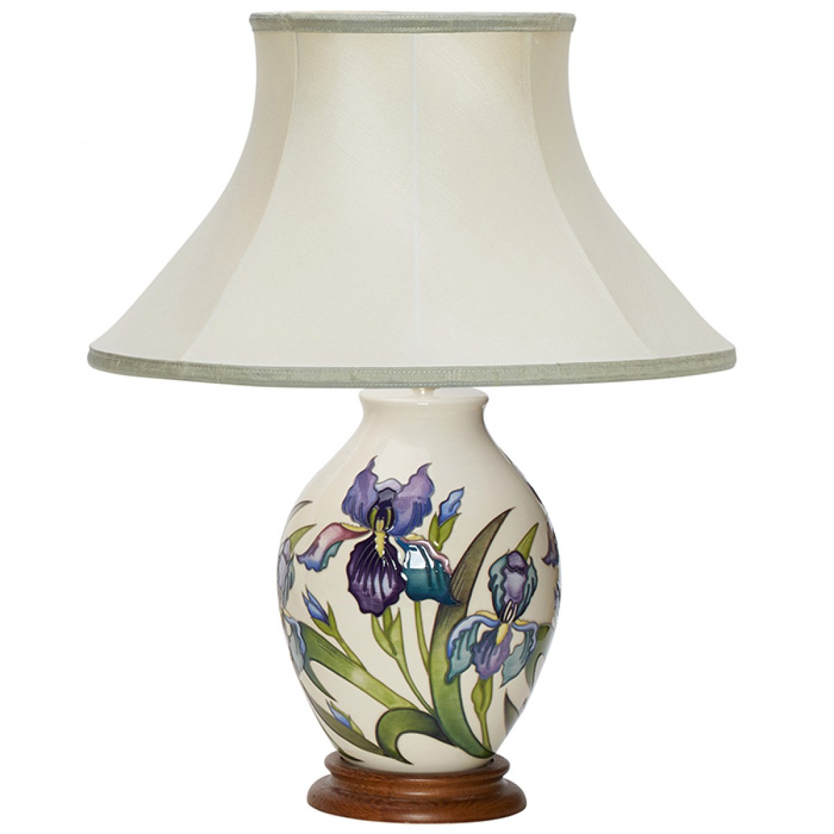 The standards are purple and ruffled. The falls, soft velvety, black-maroon with lightly ruffled edges, making this lamp a sumptuous treat, especially when colours morphs into pale lilacs, blues and baby pinks with hints of aquamarine. The Iris family as a whole is enormous, with a multitude of shades and hues, allowing the Moorcroft heritage brand to showcase its artistry with the Bearded Iris; one of the most popular and classic garden irises, loved for its wide range of colours and showy form against their slim, lance-shaped, vibrant-green foliage.