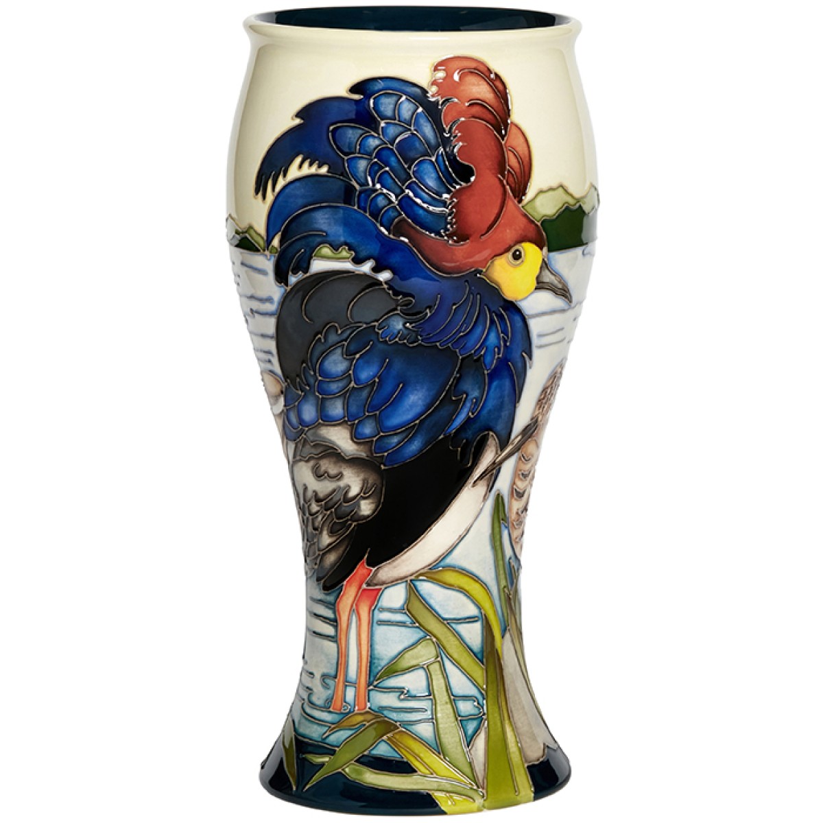 In the avian world, extreme extravagance of attire is often the domain of the male. Kerry salutes the male of the Ruff species, allowing him to fan the flames of a riverside drama like an audacious character in a pantomime, with electric blue and red feathers that soar out like an over fashioned feather bonnet, complete with a plunging neckline of marmalade and enormous blue pagoda sleeves – like a Bourbon Queen, the impact is immediate.