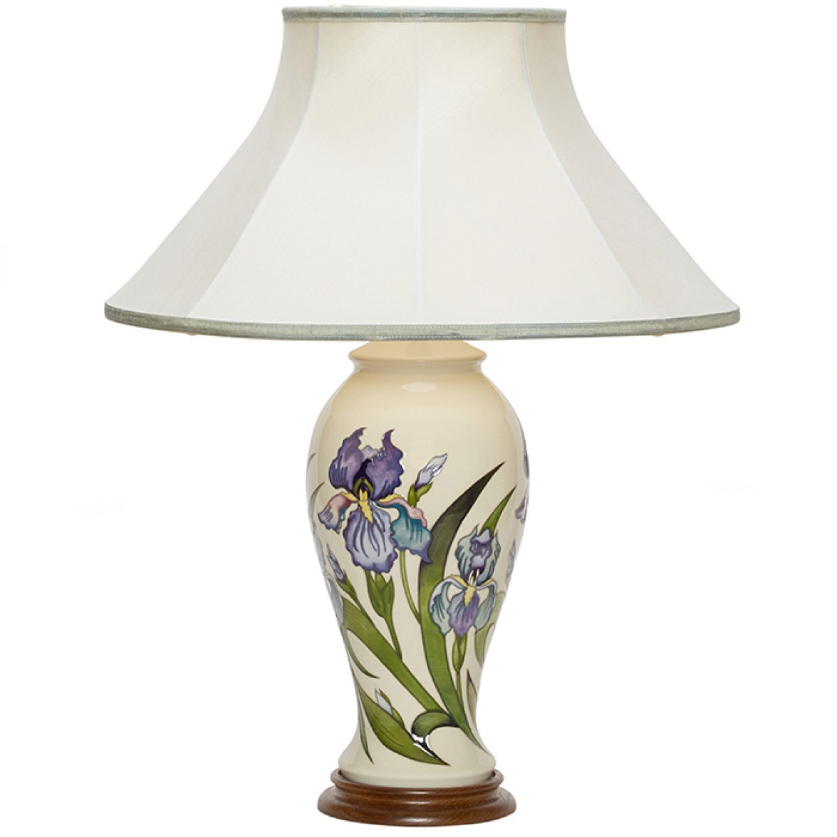 The standards are purple and ruffled. The falls, soft velvety, black-maroon with lightly ruffled edges, making this lamp a sumptuous treat, especially when colours morphs into pale lilacs, blues and baby pinks with hints of aquamarine. The Iris family as a whole is enormous, with a multitude of shades and hues, allowing the Moorcroft heritage brand to showcase its artistry with the Bearded Iris; one of the most popular and classic garden irises, loved for its wide range of colours and showy form against their slim, lance-shaped, vibrant-green foliage.
