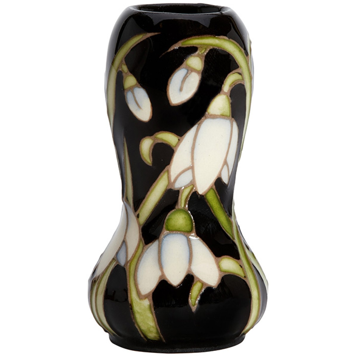 Inspired by a children’s song, this diminutive vase showcases tiny snowdrops with a soft blush of pale blue to their white petals, standing out with dramatic effect from the classic Moorcroft blue ground on which they are set.
