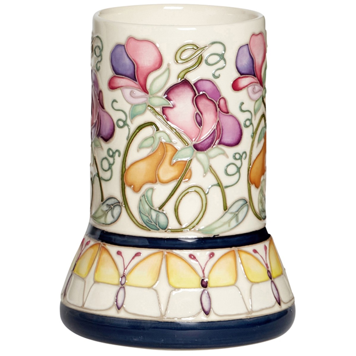 Stylised pale orange and white winged butterflies, circle, wing to wing, within Art Deco banding. Their wings are outstretched and still, as if displayed in a lepidopterist glass cloche. In contrast, delicate sweet pea petals of honey, violet and pink lemonade, swivel, and fold with sublime movement.