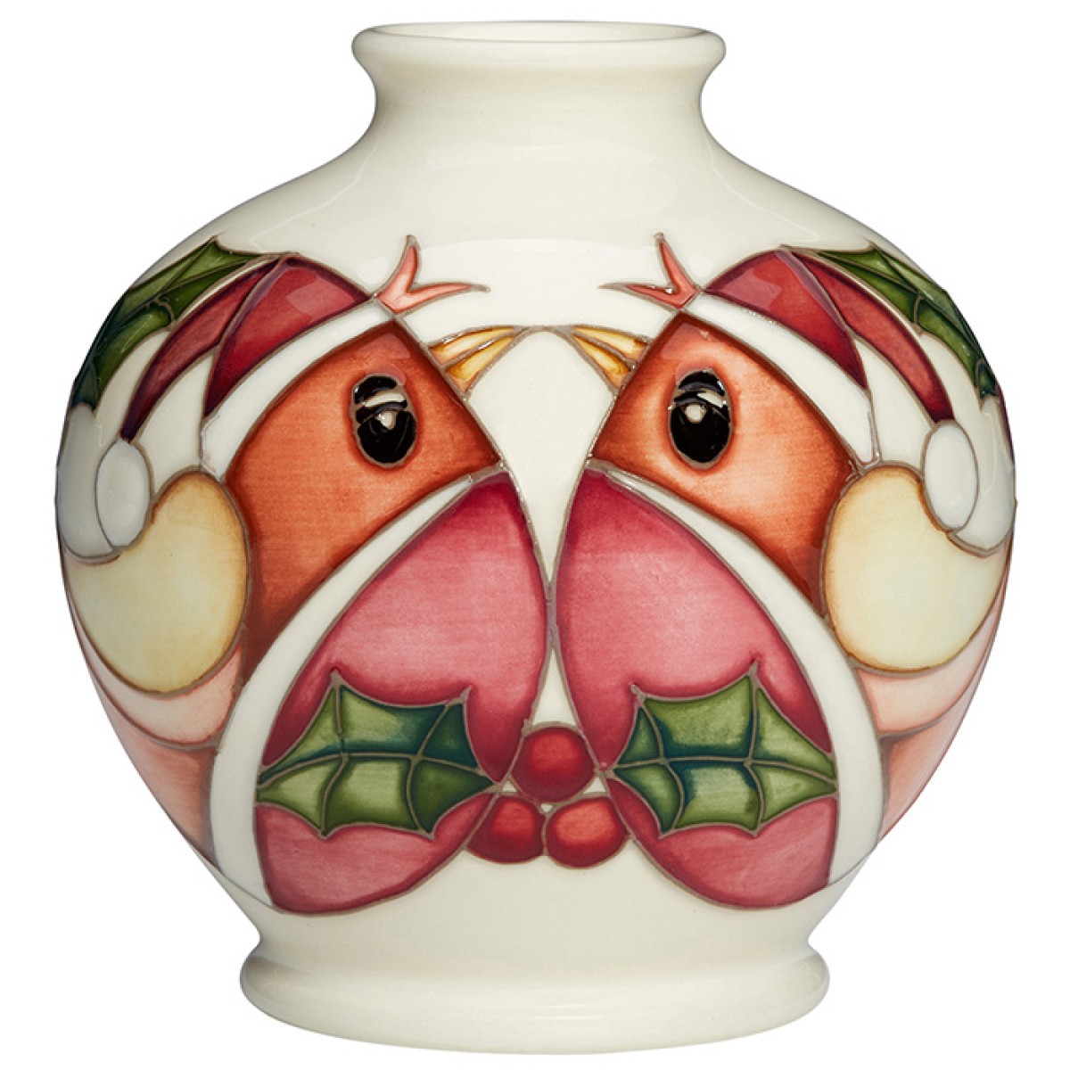 In this light-hearted design, Nicola crowns a ring of robins with red Christmas hat as they sit merrily amongst Christmas holly and red berries.