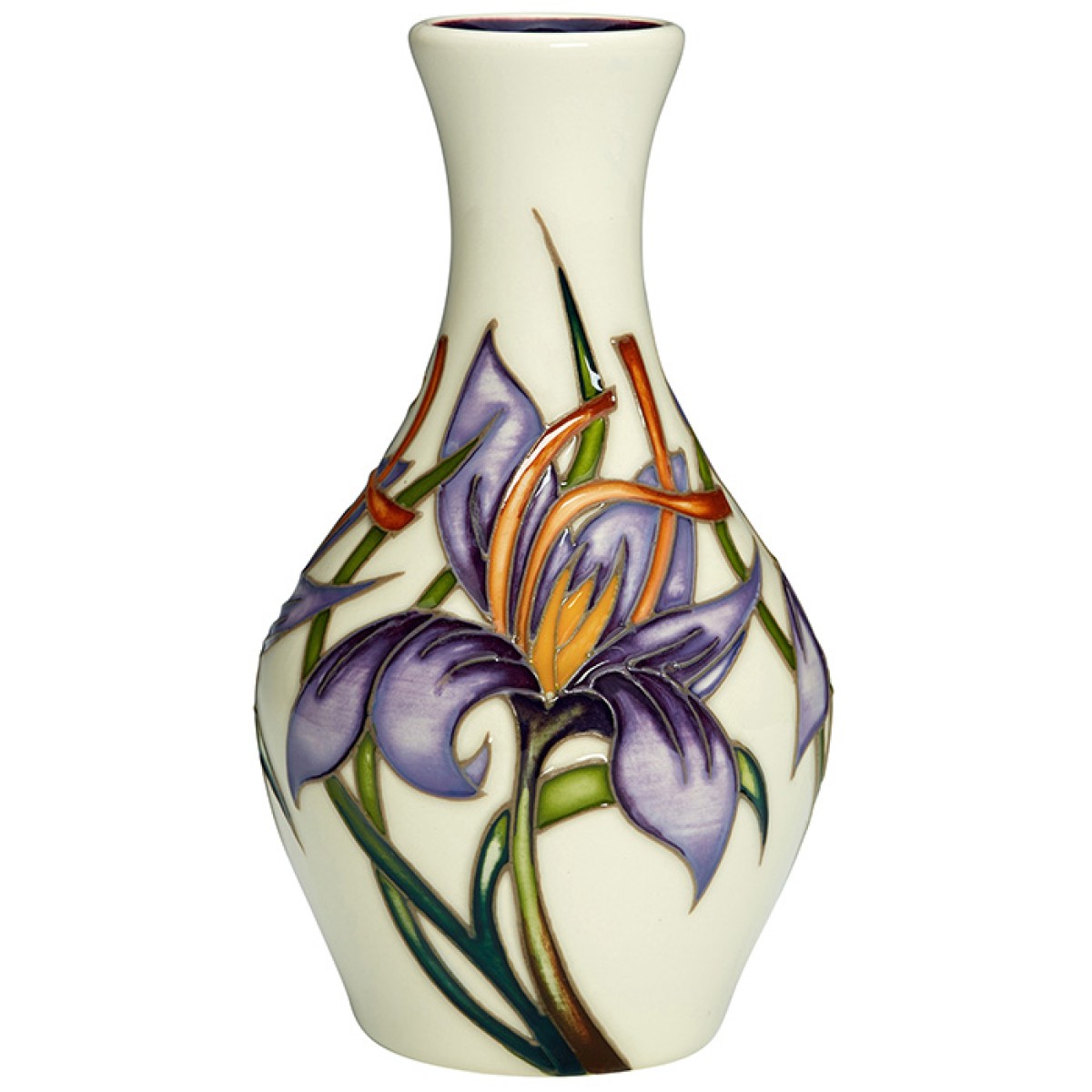 Saffron Walden is a market town in the Uttlesford district of Essex, not far from Maureen and Hugh’s current home. In the 16th and 17th centuries the saffron crocus (Crocus sativus) was widely grown, thanks to the town's favourable soil and climate. The stigmas of the flower were used in medicines, as a condiment, in perfume, as an expensive yellow dye, and as an aphrodisiac. The industry gave Walden its present name. In 2003, Emma Bossons created the popular design Saffron Crocus. The whole of its proceeds flowed into nearby Thaxted Church funds, enabling repair and renovation work to continue. Over the years, Moorcroft has gelled with the community of Thaxted thanks to the efforts of the Edwards family. Today, Nicola Slaney picks up the saffron idea to symbolise this unique relationship. Saffron Gold is a simple but effective design. Purple petals intwine with golden stigmas. Hugh and Maureen have been worth their weight in gold in their community, much like the 70,000 saffron plants that are needed to make 1 pound of saffron!