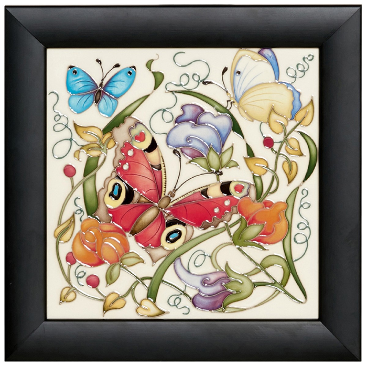 Loved by pollinators, memorable pink-purple and rouge-gold hues adorn the blooms of these sweet peas. Like delicate, almost translucent insect wings, they flutter and curl, amid swirls of foliage. The Peacock butterfly’s spectacular pattern of eyespots - startling violet-blue against the rusty-reds - dazzle momentarily before the fusion of marmalade, pink and violet of sweet peas and cornflower-blue butterflies vye for attention.