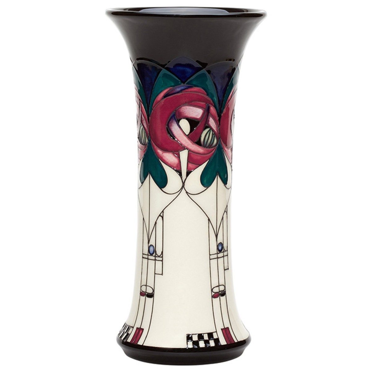 Here in the mural decorations, symbols and shapes began to emerge. Stylised calla lilies with pure white petals and green stamens stand side by side to create a geometric pattern. Elongated straight lines and dots, dashes and small squares perforated the design, appearing almost like hieroglyphs to be deciphered by the curious diners. Nicola has put her own unique twist on Mackintosh’s linework, as her calla lilies have emerald green centres and red stylised Mackintosh roses adorning the top of this Moorcroft vase.