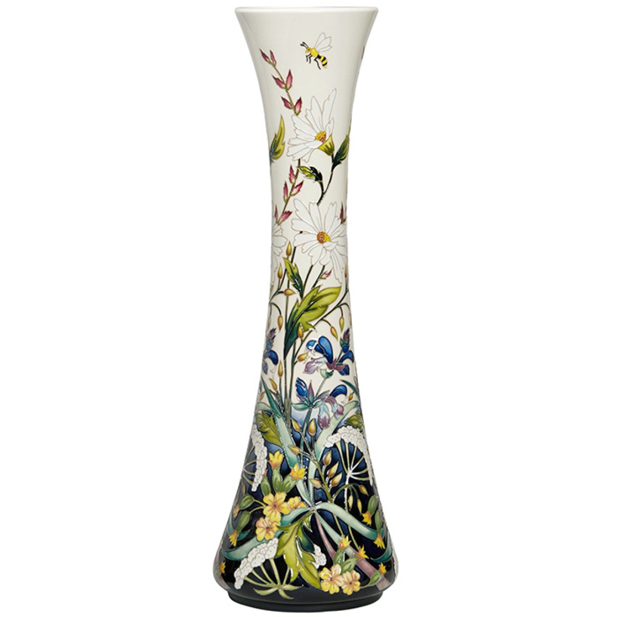 Nicola’s vision was to create her very own wildflower meadow. To do this she chose cowslip, meadow sage, oxeye daisies, wild grasses and wild carrot too. While the bright yellow cowslips and clouds of white wild carrot, also known as bishop’s lace, vie for space around the base of the vase, the meadow sage shoots above them with its vibrant blueish-purple petals bringing a splash of colour to the summer meadow. The large oxeye-daisies are in full bloom with their golden centres appealing to the bees that frequent the wild meadow looking for a rich source of nectar. There is a great sense of movement amongst the meadow plants, as the summer breeze makes the sway, enhancing the feeling that Wild Carrot Meadow is full of life and vitality.