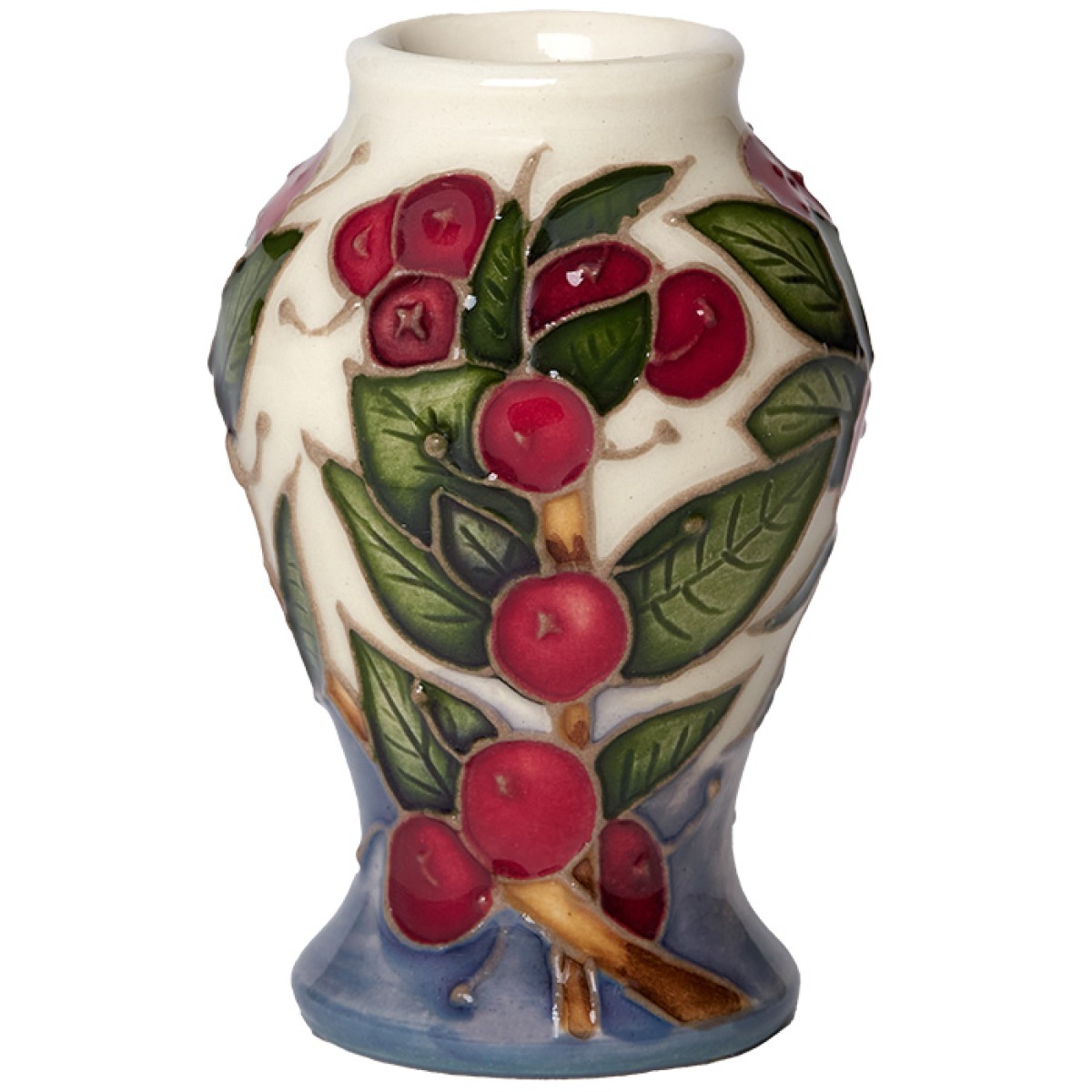 Tiny red, round berries bring a touch of colour and festive cheer to this miniature vase. A cascade of green leaves surround the berries, while behind them a rich blue coloured base fades to pure white, as if a flurry of snow has started to fall.