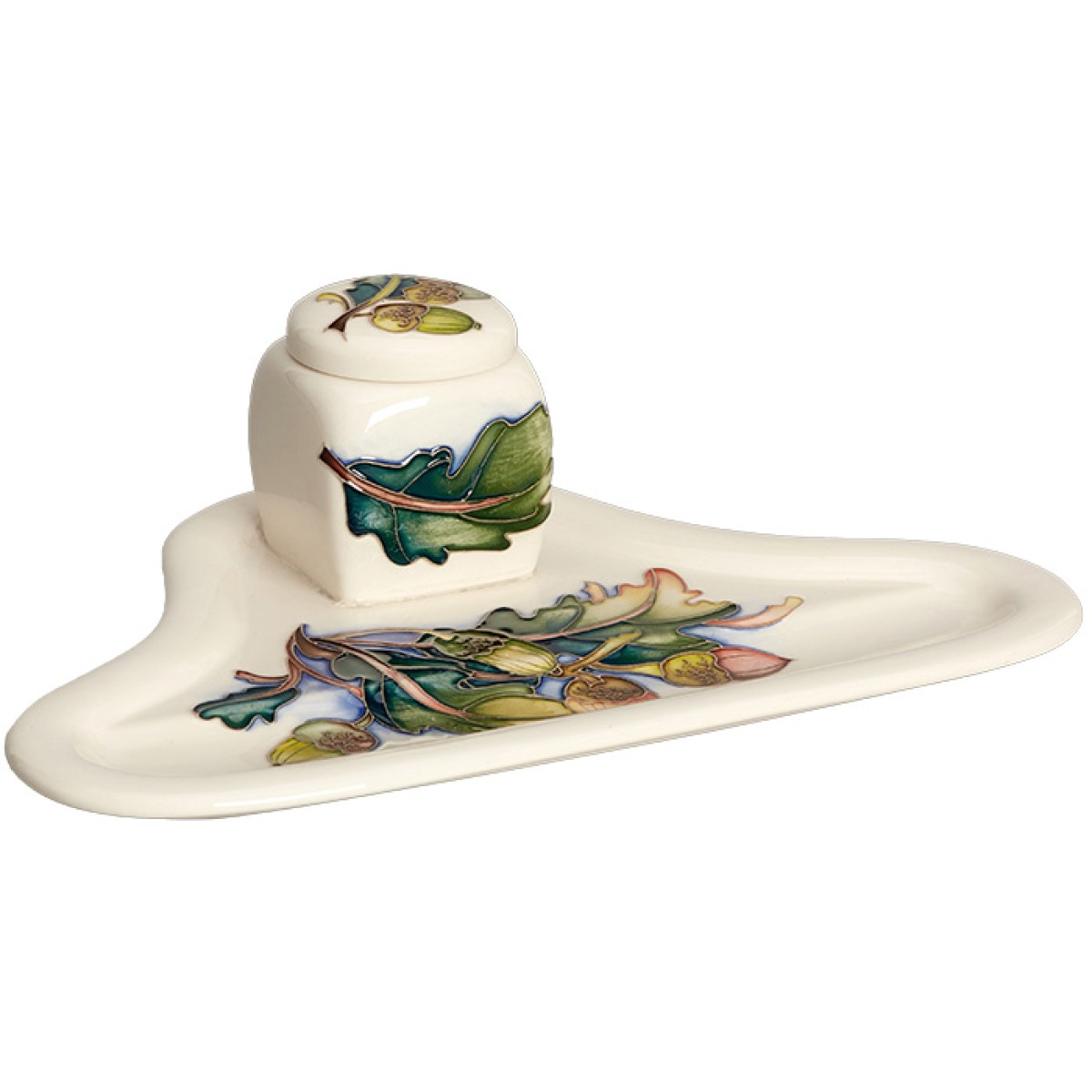 Iron Gall ink is in fact one of the oldest forms of ink known to man. It was certainly use by the Romans and then throughout the ensuing centuries. The components of the ink are important as the galls of the oak tree contain gallotanic acid, which can be released from the galls by crushing them. If this is then mixed with water, a form of iron sulphate and gum Arabic it creates an ink. Jane Austen’s surviving manuscripts were written in a variety of this home-made iron gall ink and Moorcroft wanted to pay homage to the writer by creating a design on both an inkwell but also on a candlestick, the type that Jane may have used to illuminate her work as the nights drew in and the days became darker.