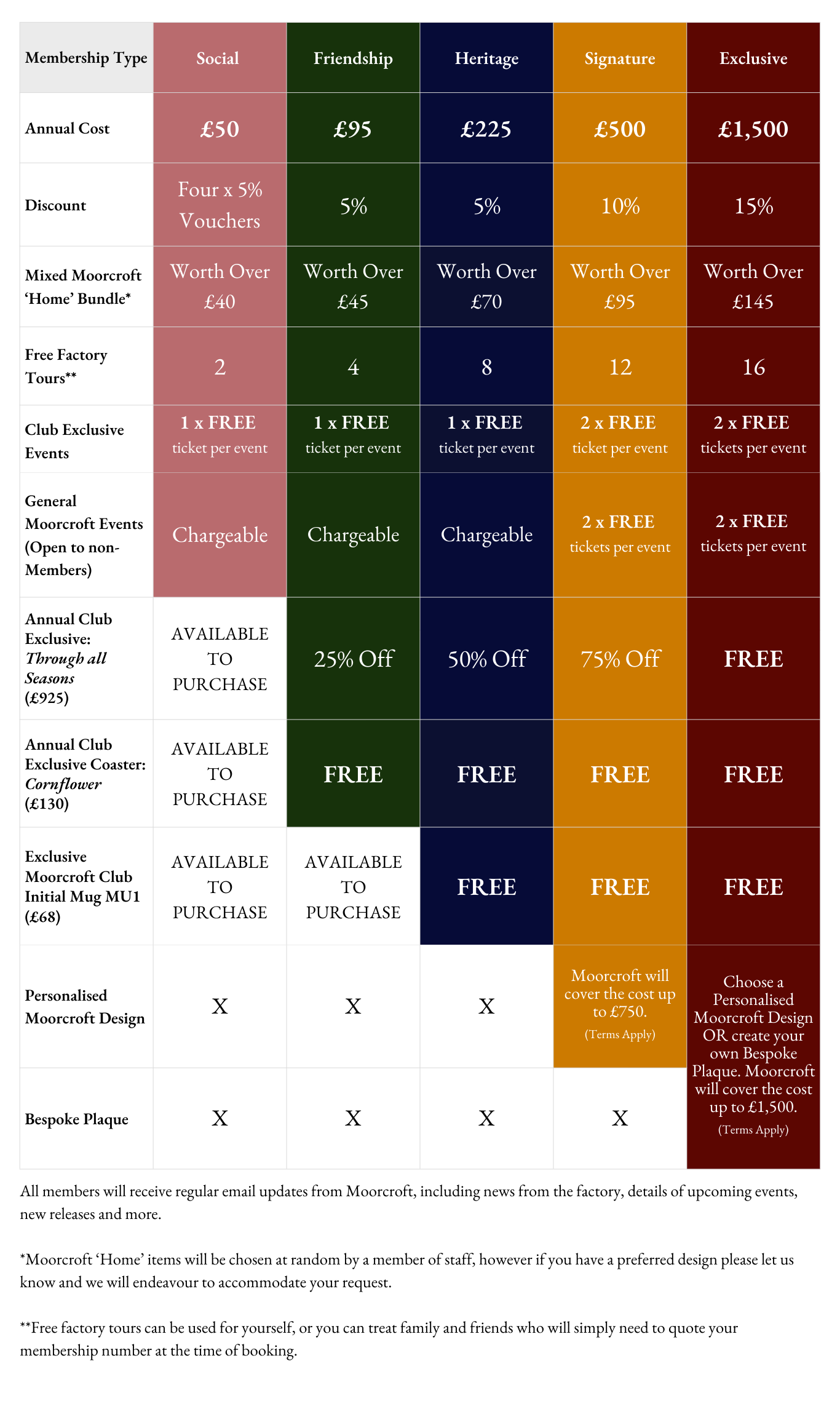 Our Heritage Membership not only offers year-round discount but also a complimentary Cornflower coaster and a Moorcroft Initial Mug (featuring the initial of your choice). Plus enjoy 50% off the Annual Club vase. This will suit Moorcroft collectors who enjoy exclusive designs and year-round discounts.