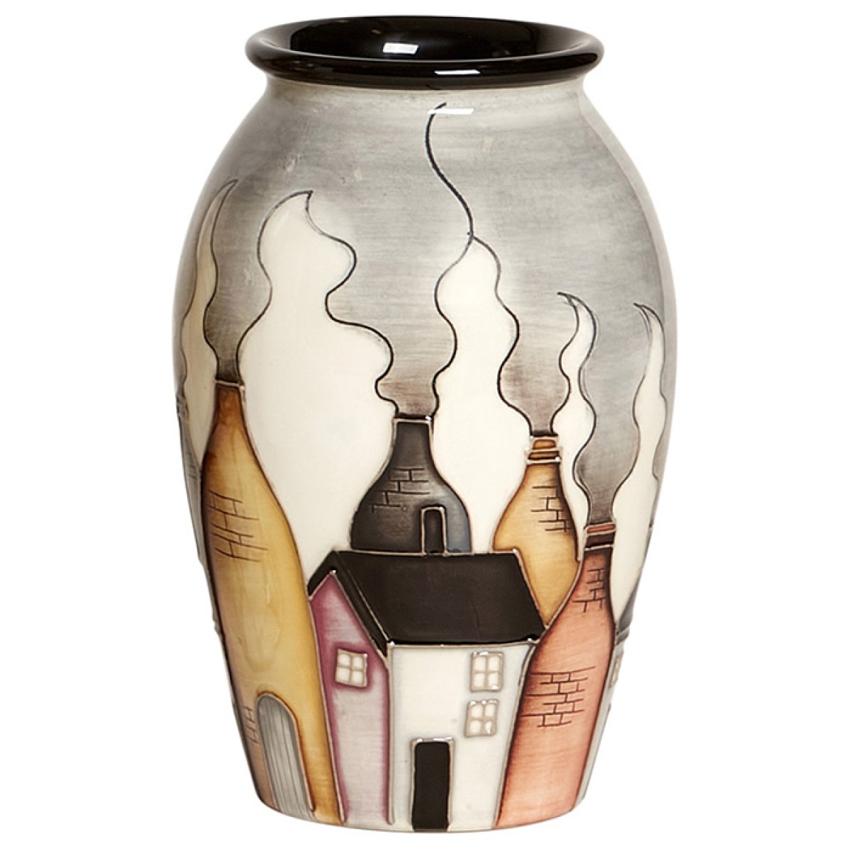 Burslem, home to the world-famous Moorcroft pottery, is locally known as ‘The Mother’ Town. It is one of six towns that together make up the City of Stoke-on-Trent. Burslem contains Britain's last real working industrial district, where people live within walking distance of the numerous pottery factories and as a result much of the nineteenth-century industrial heritage, buildings and character of the town have survived intact. Designer, Nicola Slaney celebrates Burslem’s history with this design that sees the soot covered smoking bottle kilns of yesteryear intermingled with grey pot bank buildings. History and heritage are still alive in this industrious image of a bygone age.