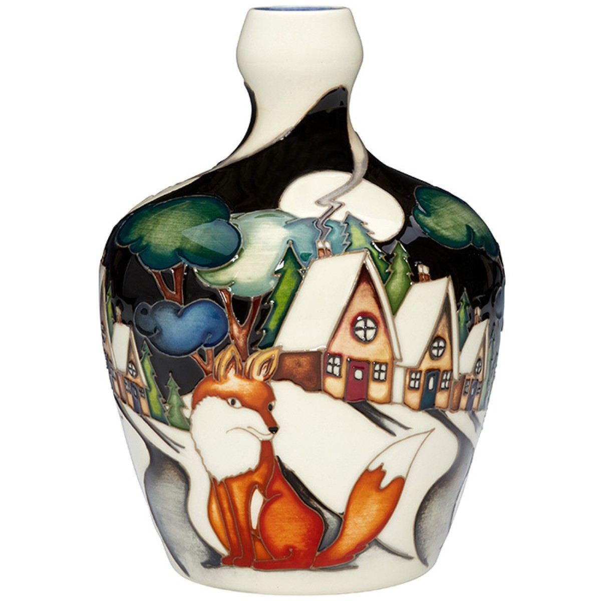 Padding silently through the soft winter snow, a lone urban fox patrols a village of wooden lodges. The final wisps of smoke from log burners make their way up to the sky where a full moon illuminates the night.