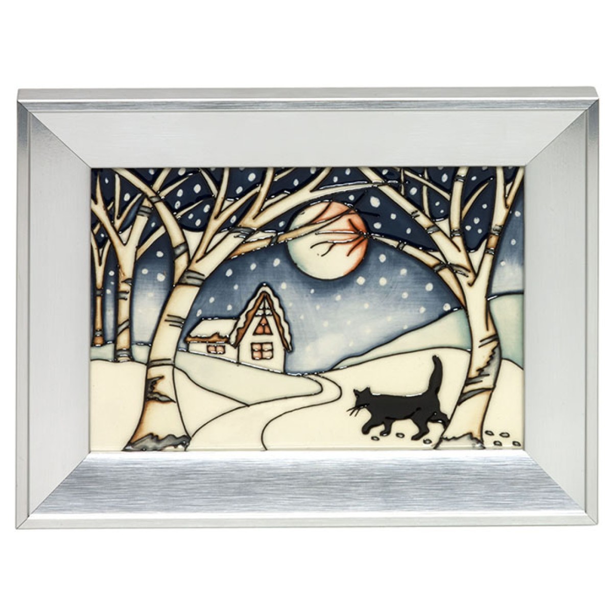 Throughout the year Mr Coal, as stealthy as they come, can pass unnoticed between the hedges and outbuildings of his home. Yet when the time comes for a blanket of pure-white snow, his camouflage is lost and his prowling becomes evident for all to see. Rachel’s stirring mid-winter scene surrounds this slinky black cat, who pads his cold paws under a snowy moonlit-sky. Heading in the direction his homely cottage, Mr Coal the Christmas Cat detects a faint whiff of turkey gravy in the air…
