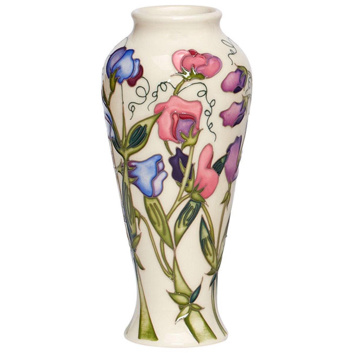 With their delightful wisps and tendrils, sweet peas have made a lovely floral subject at Moorcroft for decades and so their reoccurrence was inevitable. Nicola scattered a wild and unkempt cluster of the colourful annual flowers, with delicate tendrils tubelined in green, for the Moorcroft Club’s 30th anniversary in 2017. Its popularity was instant and could simply not be ignored. With connoisseurs eager for more, Sweetness made a very welcome re-appearance in 2018. Nicola has used a pure white background to her design and as a result her sweet peas appear bright, cheerful and tempting.