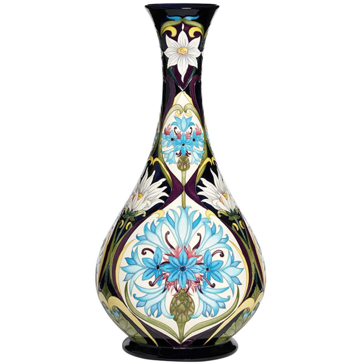In traditional Arts and Crafts styling, a large blue cornflower engulfs a central roundel. Cornflowers are solitary blooms with powder-blue flowerheads. Delve deep into the flower and explore the myriad lines and many individual petals, each with a unique star shape. Next, you may wish to turn your attention to daisies set dramatically against an ebony ground, flanking the cornflower roundel like white spumes on an ocean wave. Above, pointed petals touch another roundel on the neck of the vase, this time sporting a cornflower in profile. To complete her design, Rachel places a small rosette under the lip of the vase, its yellow-eye piercing through the star-spangled frosting.