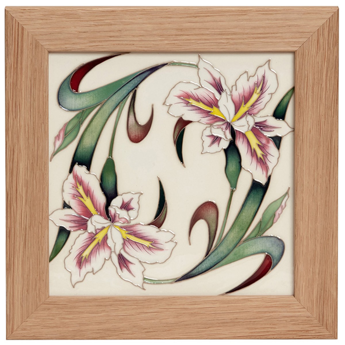 A Pacific Coast Iris (PCI) bred by Marjorie Brummitt and named after her dog 'Candy'. Jennifer Hewitt who founded the West and Midlands Iris Group in 1974, obtained her first irises from Marjorie and the friendship continued for many years. Moorcroft are glad as this Sugar Candy plaque is as elegant as it is sweet and holds diagonally mirrored blooms which are cooled by basal fans woven among the three standards, and three large, spreading falls. Pacific Coast group irises lack the “beard” of coloured hairs at the base of each fall that other iris groups have but hold unique colourways like ‘Sugar Candy’ with her short, fawn and maroon flowers.