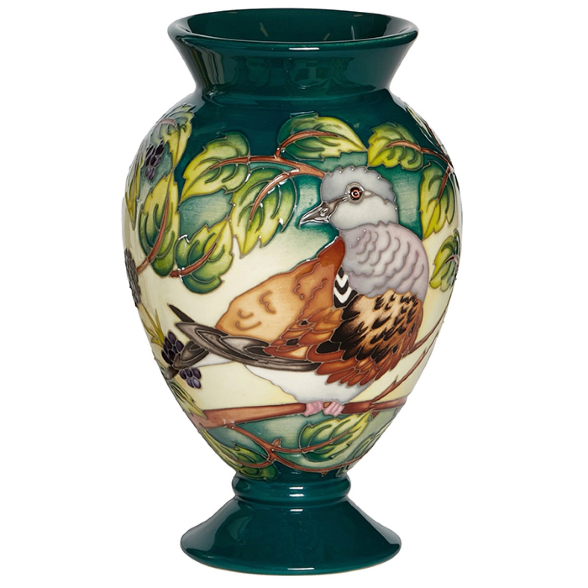 The smallest native pigeon, turtle doves are the UK's fastest declining bird species, and they are threatened with global extinction (IUCN Red List of Endangered Species). Kerry champions the beauty of this delicate bird, traditionally released and mentioned at weddings for good fortune, with one dove glancing shyly to its side, displaying clearly its sandy-bronze dappled wings. The other dove peeks downwards from its bush hideout, with its striped chequered neck marks and lilac -pink flushed cheeks on soft, slate-grey, commanding attention against the traditional Moorcroft forest-green wash for this is A Time For Singing.